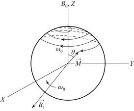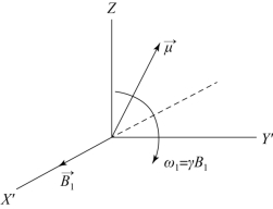 前文提到,在均匀磁场中的自旋质子进行拉莫进动,现在向其发射射频(RF)电磁波,那么除了恒定磁场B0外还会有一个射频电磁场作用。该射频场的磁场分量为B1,与B0方向垂直,振动角频率为ω,在旋转坐标系中绕B1进动。可以定义一个坐标系X′Y′Z′,它的Z′轴与固定坐标系Z轴重合,X′轴与B1重合,即X′Y′Z′与矢量B1一起以角频率ω进行旋转。当B1变化的角频率与