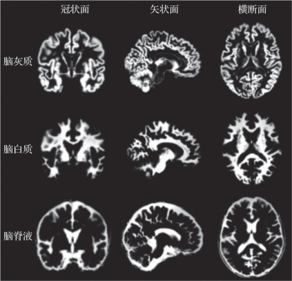 (3)脑组织分割:SPM软件对于经过标准化的个体脑图像,按照每种成分的不同,灰度值将脑组织分割成灰质图、白质图和脑脊液图(图5.16),VBM方法主要是对每个体素的灰质图和白质图进行浓度与体积的定量分析。