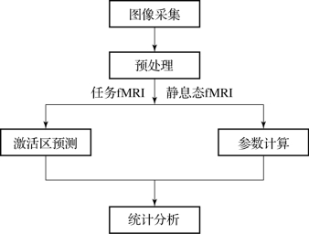 功能图像数据分析分为三个阶段(图5.17)。首先是预处理,数据预处理可以有效抑制噪声,提高信噪比,尽可能排除或避免对反映认知任务的血氧反应信号产生干扰作用的其他因素。对于任务态fMRI,第二步是激活区检测,在此阶段检测出与任务相关的激活体素。在磁共振成像实验后可得到被试的功能像和结构像。利用功能像数据计算得出各个体素的统计量,用伪彩色在结构像上表示,得到统计参数图。不同的激活区检测方法、不同的统计量,形成不同的统计参数图。第三步是对激活脑区或感兴趣区进行定量分析,包括时间曲线变化情况,以及定量度量各激活区的时间或空间相互关系。对于静息态fMRI数据,第二步是一些参数的计算,基于预处理后的脑图像,根据不同的研究目的,我们可以计算低频振荡振幅(amplitude of low frequency fluctuations,ALFF)、局部一致性(regional homogeneity,ReHo)等指标,最后对上述指标进行组水平的统计分析,得到统计参数图。
