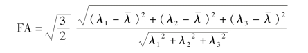 各向异性比值(fractional anisotropy,FA)可以形象地理解为扩散椭球“椭”的情况,FA越大,椭球越扁长。它是扩散张量的各向异性成分与整个扩散张量的比值: