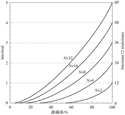 图7.7 ITR与准确率及分类数量的关系(摘自Brain-computer interface technology:a review of the first internationalmeeting[6])