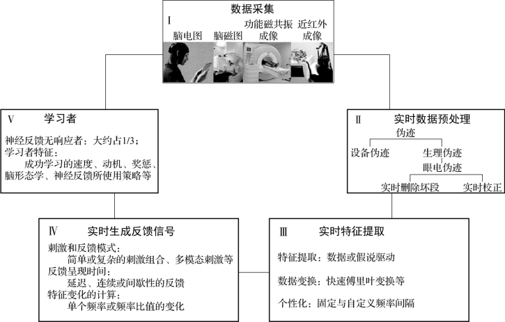 应用前面介绍的操作性条件反射理论与强化学习理论,可以针对大脑训练构建闭环神经反馈系统,该系统由五部分组成:数据采集、实时数据预处理、实时特征提取、实时生成反馈信号、学习者(图8.3)。