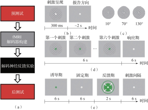 2011年,Shibata教授研究组在Science杂志上发表文章[7],应用解码神经反馈技术研究成人视觉感知学习的特异性取向,探讨早期视觉区域的可塑性,结果表明该技术能够以高度选择性的方式诱导早期视觉区域的可塑性,未来可应用于康复和强化训练。实验过程如图8.8所示。