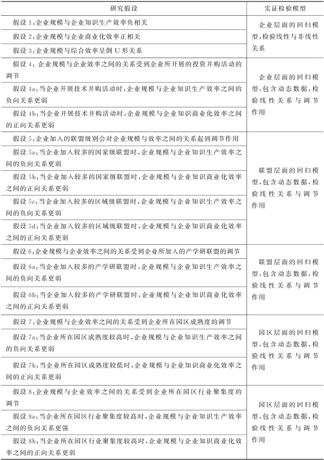 本章构建了“技术并购—联盟—园区”研究模型,探讨了企业规模与企业创新效率两者之间的关系,并对所涉及的三个层面进行了深入的剖析,提出了对应的研究假设。首先,探讨了企业规模与知识生产效率、知识商业化效率和综合效率这三种不同的企业效率之间的关系,其中包括比较规模对不同效率的影响的研究假设。其次,探讨了企业技术并购对企业规模与效率之间关系的调节作用;再次,探讨了企业所加入的联盟对企业规模和效率之间关系的调节作用,其中包括企业所加入联盟的级别(国家级联盟与区域级联盟)与联盟的类型(是否产学研联盟)的不同作用的研究假设。最后,探讨了企业所处园区特征对企业规模与效率之间关系的调节作用,其中包括企业所处园区的成熟度、企业所处园区的行业聚集度的影响作用的研究假设。对本章提出的研究假设的总结如表3.1所示,在之后的章节中将对上述假设进行实证检验。