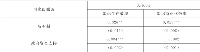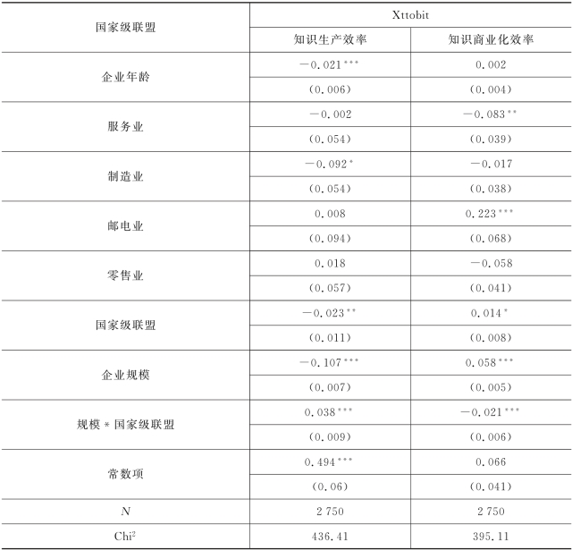 本书也加入了采用Xttobit回归的模型作为稳健性检验。检验的结果如表7.3所示,所有模型的Wald Chi2值依旧非常显著(p<0.01)。在知识生产效率的模型中,企业规模的系数为负且在1%的显著性水平下显著(β=-0.107),企业规模与国家级联盟的交互项为正且在1%的显著性水平下显著(β=0.038);在知识商业化效率的模型中,企业规模的系数为正且在1%的显著性水平下显著(β=0.058),企业规模与国家级联盟的交互项为负且在1%的显著性水平下显著(β=-0.021)。这两个Xttobit模型与包含相同变量的前两个模型结果基本一致,所有变量系数的符号、显著性都保持不变,系数也较为接近,因此以上对于回归结果的分析较为稳健。