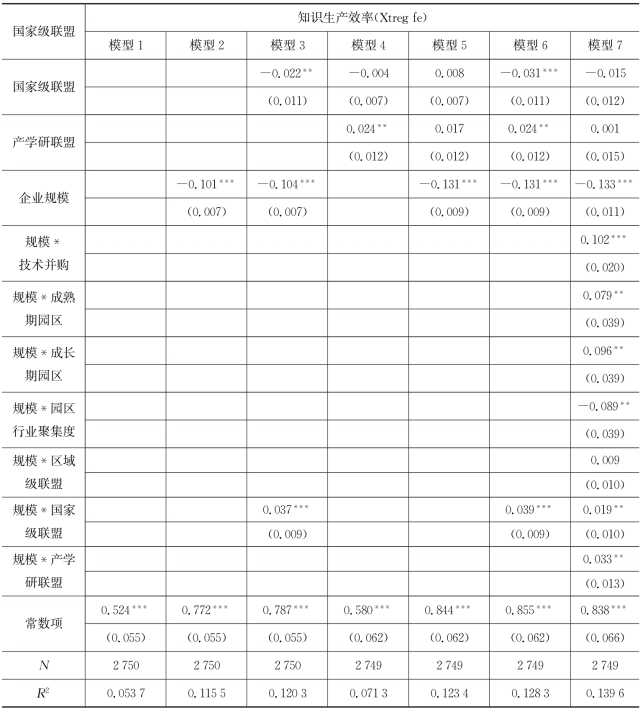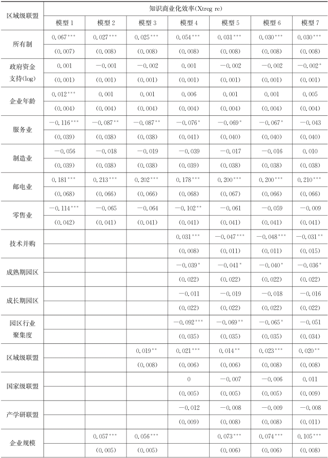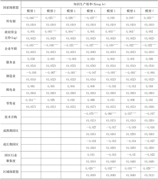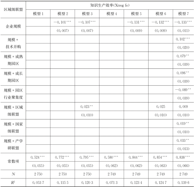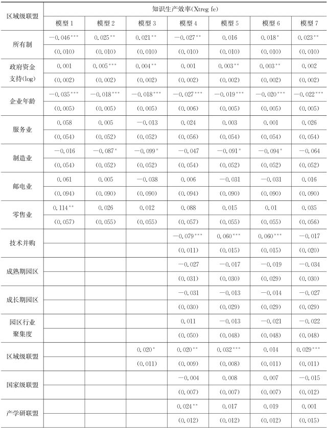 表7.4 企业所加入的区域级联盟对企业知识生产效率作用模型的回归结果