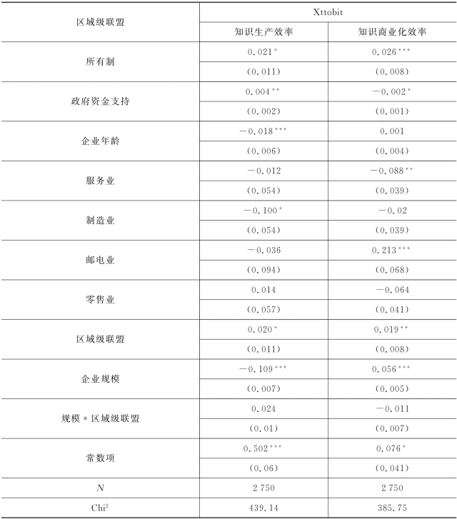 本书也加入了采用Xttobit回归的模型作为稳健性检验。检验结果如表7.6所示,所有模型的Wald Chi2值依旧非常显著(p<0.01)。在知识生产效率的模型中,企业规模的系数为负且在1%的显著性水平下显著(β=-0.109),企业规模与区域级联盟的交互项为正,但是不显著;在知识商业化效率的模型中,企业规模的系数为正且在1%的显著性水平下显著(β=0.056),企业规模与区域级联盟的交互项为负但是不显著。这两个Xttobit模型与包含相同变量的前两个模型结果基本一致,所有变量系数的符号、显著性都保持不变,系数也较为接近,因此以上对于回归结果的分析较为稳健。