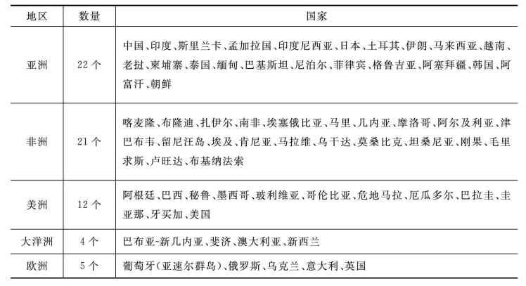 目前世界五大洲都产茶,种茶的国家有60余个(见表1-1),最北可达北纬49°,位于乌克兰外喀尔巴阡,最南可达南纬33°,位于南非纳塔尔。