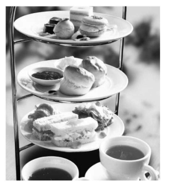 英国最有特色的茶点有英式松饼(如蓝莓松饼、肉桂松饼、全麦松饼等)、水果蛋糕、三明治等。正式的下午茶点心一般被垒成“三层架”的形式(见图2-8),最底层放置三明治,中间一层放置经典的英式松饼,最上层则放置蛋糕、水果塔等甜食。茶点的食用顺序要遵循由淡到重、由咸到甜的原则。从三层点心盘的最底层开始品尝,先尝带点咸味的三明治,让味蕾慢慢品出食物的味道,再饮几口芬芳四溢的红茶。接下来品尝涂抹上果酱或奶油的英式松饼,丝丝甜味在口腔中慢慢散开。最后品尝甜腻厚实的水果塔及芝士蛋糕,感受甜蜜的滋味。