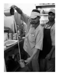 拉茶制作工艺除了配料复杂外,“拉”是关键技术。正是对茶汤的反复拉制,使茶汤和牛奶的混合更为充分,并且使牛奶颗粒因受到反复倒拉、撞击而形成乳化状态,使其既能与茶汤有机结合,又能使茶香和奶香获得充分的释放。制茶者一手持空罐,一手持盛有茶汤的罐子,将茶汤间距至约1米的距离倒入空罐,由于茶汤在倒入空罐的过程中,两手持罐距离由近到远,近似于拉的动作,故名“拉茶”。拉茶的饮用冬夏皆宜,冬天饭后热饮,更有助于暖身(见图2-9)。
