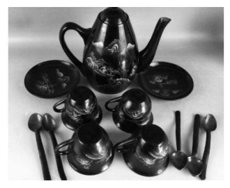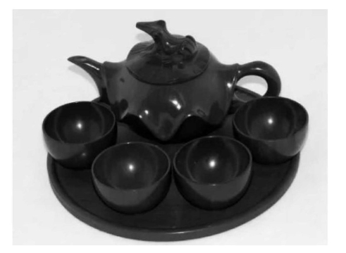 漆器茶具(见图3-13)是采割天然漆树液汁进行炼制,再掺进所需色料制成的。它是我国先人的创造发明之一,但在很长的历史发展时期中,一直未形成规模生产,直至清代才开始流行,它主要产于福建福州一带。漆器茶具较著名的有北京的雕漆茶具、福州的脱胎茶具,江西鄱阳、宜春等地生产的脱胎漆器茶具等,均极具艺术魅力。其中,福州生产的漆器茶具多姿多彩,有宝砂闪光、金丝玛瑙、釉变金丝、仿古瓷、雕填、高浮雕和嵌白银等品种,而红如宝石的赤金砂和暗花等新工艺的运用,使漆器茶具更加鲜丽夺目,逗人喜爱。福州生产的脱胎漆器茶具通常是一把茶壶连同四只茶杯,存放在圆形或长方形的茶盘内,壶、杯、盘通常呈一色,多为黑色,也有黄棕、棕红、深绿等色,轻巧美观,色泽光亮,明镜照人。脱胎漆茶具除有不怕水浸、耐高温、耐酸碱腐蚀的实用价值外,还有很高的艺术欣赏价值,融书画于一体,饱含文化意蕴,常为鉴赏家所收藏。