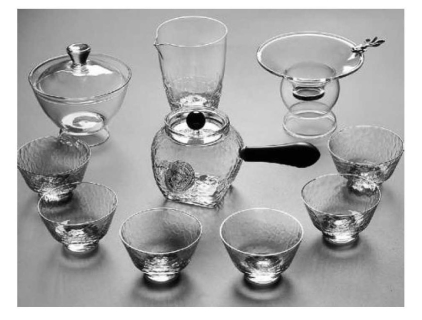 玻璃茶具(见图3-15)一般是将含石英的沙子、石灰石、纯碱等混合,在高温下熔化、成形,再经冷却后制成。玻璃茶具有很多种,如水晶玻璃茶具、无色玻璃茶具、玉色玻璃茶具、金星玻璃茶具、乳浊玻璃茶具等。用玻璃可制成各种其他盛具,如酒具、碗、碟、杯、缸等,多为无色,也有用有色玻璃或套色玻璃的。