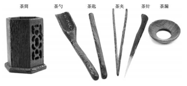 形状为花瓶造型的称为茶筒(或茶瓶);形状如勺子的称为茶勺(或茶则);形状为一扁平弯头木棍的称为茶匙(也称茶拨或茶刮);形状如夹子的称为茶夹(或茶镊);形状为一根细头针形状的称为茶针(或茶通);形状像一个环形的斗的,称为茶漏(或茶斗)(见图3-19)。