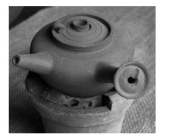 即烧开水的壶(见图3-20)。为赭色薄瓷扁形壶,容水量为200多毫升。水沸时,盖子“卜卜”作声,如唤人泡茶。此壶不但能避免金属水壶的异味,而且保温性能好,冬日里离炉许久仍能保持水温,久用也不易结水垢。相传古时有位工匠设计出此壶后,邀来三五茶友为它命名。茶友见此壶烧出的水清洁如玉,倒水宛若玉液输出,就取名“玉输”。后人认为“输”字不祥,便用“书”字代替。