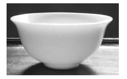 即品茶杯(见图3-23)。为白瓷翻口小杯,杯小而浅,薄如纸,白似雪,小巧玲珑,大小似半个乒乓球。容积如此之小,是因为工夫茶多为闲暇时品饮,而非为解渴。古代正宗的若琛瓯产于江西景德镇,杯底有“若琛珍藏”字样。