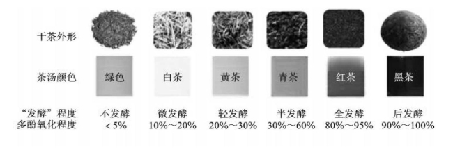基本茶类是以茶鲜叶为原料,经过不同的制造过程形成的不同品质成品茶的类别。安徽农业大学的陈椽教授依据茶叶制法、品质系统性、茶叶茶多酚氧化程度(或发酵程度)将茶叶品种划分为六大茶类(见图5-1)。