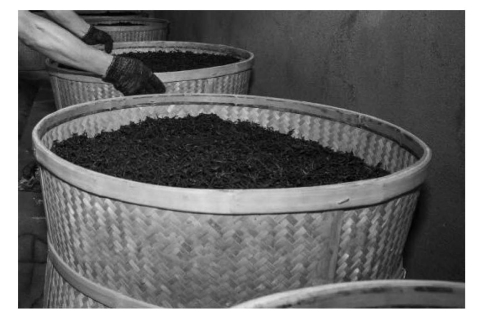 将揉捻叶置于木桶或竹篓中,加力压紧,盖湿布在日光下焐晒,并散发茶香,即成毛茶湿坯。