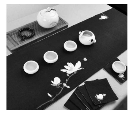 洁白的酒壶式茶组剔透如玉,婀娜多姿,以优雅之姿满载芬芳,阳光在透亮的茶面上聚焦,辉映着耀眼的金色,满满的幸福洋溢在幽静的茶席间,席间的那一抹最本色的红、绿,轻盈鲜活,仿佛让我们回到了梦里高高的茶山,在那片绿海里采摘着大自然的恩赐——那新绿的嫩蕊。茶席意在表现真我的本色精神,品味大自然浓浓的清香气息,展现出黔红多彩多姿的独特风采(见图9-9)。
