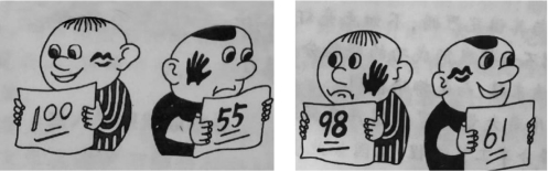家长2:仅从表面上看,母亲对从满分降到98分的退步的孩子满是责备,而对虽然一开始不及格,但后来进步的孩子很满意,是不是说明这位母亲认为只有成绩上升才是值得肯定的?在这幅漫画中,仅仅是分数上的一点变化,便使家长做出截然不同的反应,这种现象需要反思。