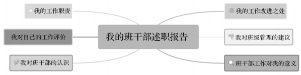 教师1:首先要组建高素质的班干部团队,这不仅需要教师的慧眼,还需要相应的策略和方法。我的方法是“自主竞聘上岗”。我规定,每位班干部有一定的任期,比如一个学期。到期之后,每个班干部都要述职,再由同学对他们进行评议和打分,并进行公示。比如,我会绘制述职思维导图(图2-4),要求班干部据此述职。
