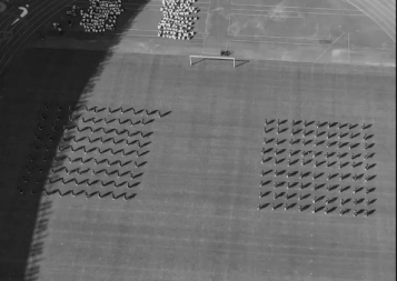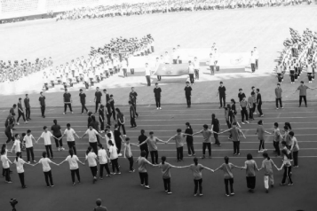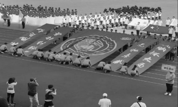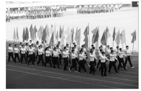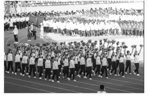 主持人A:(初一方阵解说词)恰同学少年,风华正茂;逞飒爽英姿,一代天骄。初一年级的1400多名同学(图3-8)正手执红旗向我们奔来。飘扬的旗帜,他们朝气蓬勃;涌动的红心,他们砥砺前进。看吧!他们斗志昂扬!铸就辉煌是他们的追求!看吧!他们披荆斩棘!挑战自我是他们的号角!青春的赞歌已经奏响,他们必将扬帆起航!劈波斩浪!