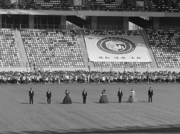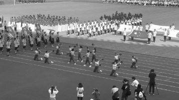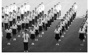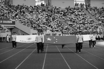 主持人C:首先入场的是校国旗队(图3-1)。伟大的祖国,请允许我们用青春热血为鲜红旗帜增添更加闪耀的色彩。