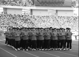 主持人B:(初二方阵解说词)现在迎面走来的是西附初中的运动员方阵(图3-7),他们燃满腔热忱,揽朝阳满怀,无须鼓角争鸣,声势已撼天动地,利刃尚未出鞘,气势已无可匹敌!志存高远者,气当勃发!万众一心者,势定英雄!他们怀着满腔壮志豪情,踏长风,渡沧海,一往无前,只留下一个背影说:超越自己,我就是胜利者!