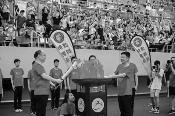 主持人B:现在初一年级火炬手把火炬交到了高一年级火炬手手中,他们是:刘杨淼、曹嘉怡、夏馨怡、叶雨澄、崔荣根。火炬的传递象征着我校体能教育长盛不衰。
