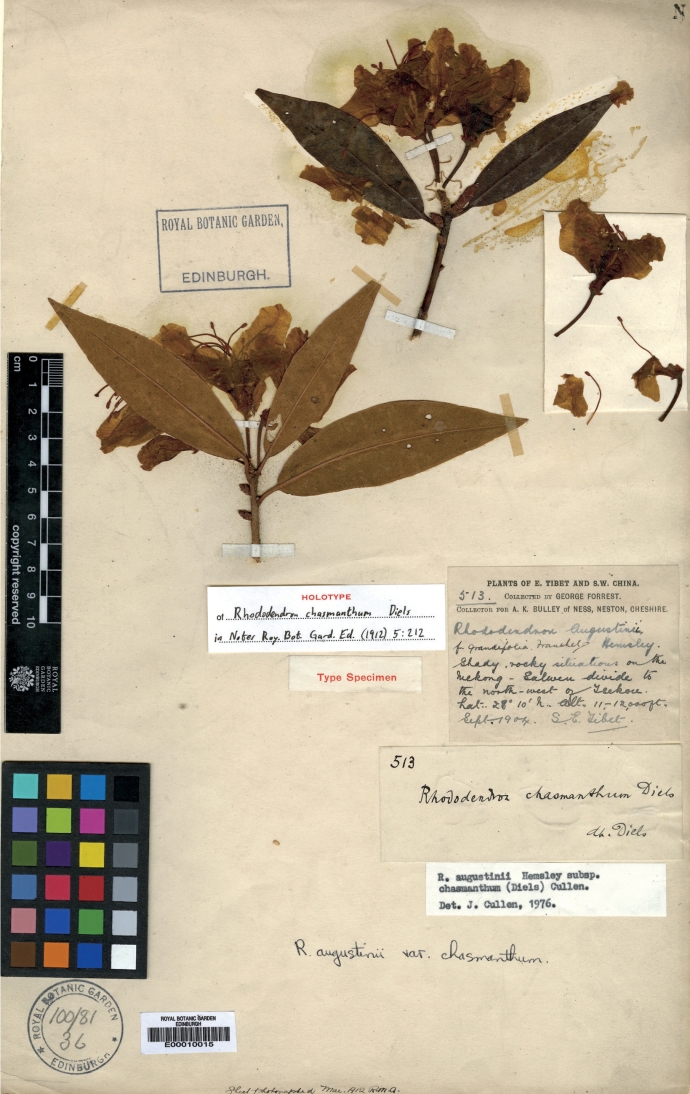 【种下等级】本种为毛肋杜鹃Rhododendron augustinii的亚种,区别在于植株各部无毛或被毛少;叶下鳞片稀疏;相距为其直径的(1~)2~5倍或更疏。