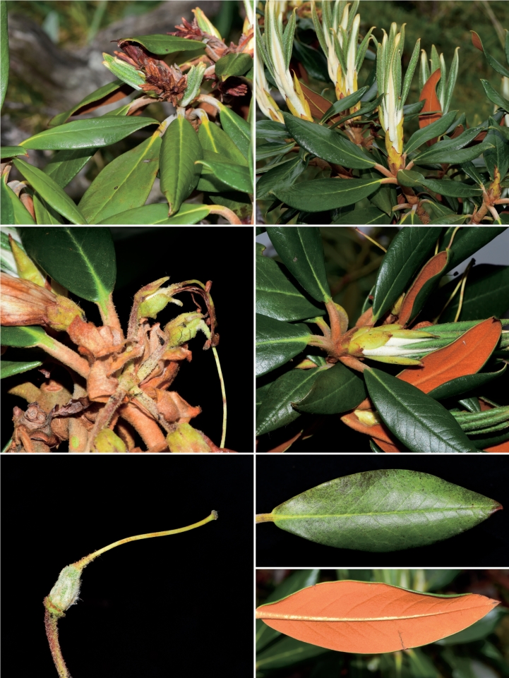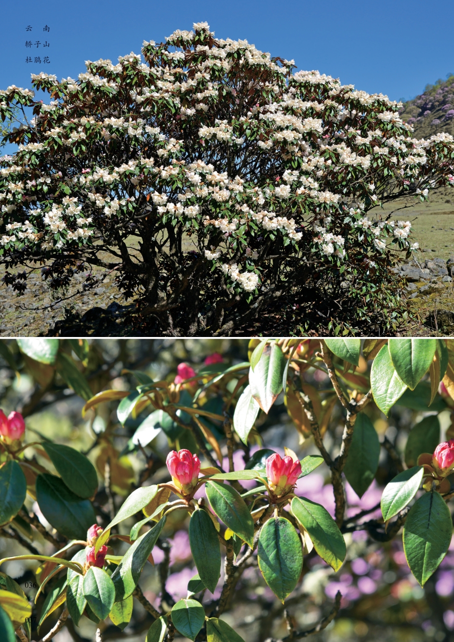 【形态特征】常绿灌木,高1~4m;幼枝密被锈红色至黄棕色厚绵毛,混生红色腺体。叶厚革质,椭圆形至倒卵状长圆形,长6~14cm,宽2.5~5cm,先端急尖或渐尖,具细小尖头,基部钝或近圆形,上面深绿色,光亮,微皱,中脉凹入,侧脉12~15对,下面密被—层锈红色至黄棕色绵毛,由分枝毛组成,中脉凸起,被毛,侧脉隐藏于毛被内;叶柄粗,长1~2cm,密被锈红色绵毛状分枝绒毛。顶生短总状伞形花序,有10~20朵,总轴短,密被锈红色分枝状绵毛,混生腺体;花梗长1.5~2cm,密被绒毛和腺体;花萼大,长5~10mm,5深裂几达基部,裂片长圆形;花冠管状钟形或钟形,长3~4.5cm,白色带粉红色至粉红色,内面基部具深红色斑和微柔毛,具紫色斑点,裂片5,近圆形,长约1.5cm,顶端微缺;雄蕊10,长1.5~2.8cm,花丝基部被白色微柔毛,花药椭圆形,暗褐色;雌蕊比花冠稍短;子房卵圆形,长4~5mm,密被短柄腺体和柔毛,有时仅被腺体,花柱基部被短柄腺体,时有长柔毛。蒴果长圆柱形,长1.5~2cm。