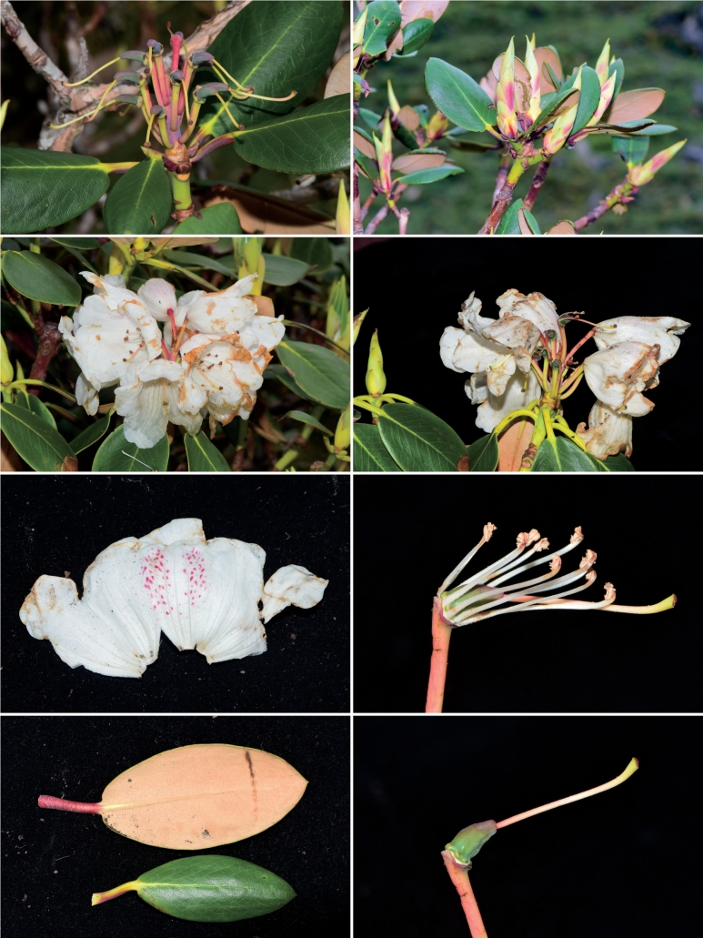 【形态特征】常绿灌木,高1~4.5m。叶革质,宽椭圆形或长圆状椭圆形,长7~15cm,宽3~6cm,先端钝或圆,具凸尖头,基部圆或钝或浅心形,边缘略反卷,上面绿色,无毛,中脉凹入,侧脉14~16对,微凹,下面密被淡黄色、锈棕色或黄褐色毡毛状薄毛被,毛被连续由分枝毛组成,中脉明显凸起,侧脉不显;叶柄长1.5~2cm,上面具纵沟,无毛或被毛。顶生总状伞形花序,有花6~12朵,总轴长2~2.5cm,无毛或略被短柔毛;花梗长1.5~2.5cm,无毛;花萼小,长1~2mm,裂片5,三角形或半圆形,无毛;花冠宽钟形,长3.5~4cm,白色或淡蔷薇色或紫丁香色,内面上方多少具紫色斑点,裂片5,圆形,长1.5cm,宽2cm,顶端微缺;雄蕊10,不等长,长1.5~3cm,花丝扁平,基部被白色微柔毛,花药长圆形,淡黄褐色,长3mm;子房长圆柱形,长7mm,无毛,花柱长2.8cm,无毛,柱头略有裂。蒴果圆柱形,长2~3cm,直径4~5mm,略弯弓,无毛。