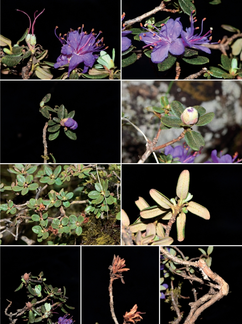 【形态特征】常绿灌木,高0.8~1.5m,分枝稠密,垫状或平卧。幼枝短,带红褐色,被暗褐色鳞片。叶芽鳞早落。叶集生于小枝顶端,革质,长圆形、椭圆形或卵形,长4.5~16mm,顶端圆或钝,有短突尖,基部钝或楔形,边缘稍反卷,上面暗绿色,被不邻接的鳞片,鳞片常为琥珀色,光亮晶莹,边缘色淡,下面灰绿色,被同式鳞片,鳞片无光泽,灰白色或黄棕色,不邻接,相距小于直径或偶有部分邻接;叶柄长1~3mm,被鳞片。花序顶生,伞形总状,有花3~5朵,花芽鳞早落;花梗短,长0.2~2mm;花萼发达,长2.5~5.5mm,裂片长圆形或宽椭圆形,外面被鳞片和缘毛;花冠宽漏斗状,长1~1.8cm,紫蓝色或鲜淡紫红色,外面常有少数鳞片,花管长3~8mm,长约为裂片的1/2,内面喉部被密毛;雄蕊(6~)10,较花冠稍短,花丝近基部被毛;子房长约2mm,被鳞片,花柱细长,超出雄蕊,无毛或罕在基部被微毛。蒴果卵圆形,长4~6mm,被鳞片。