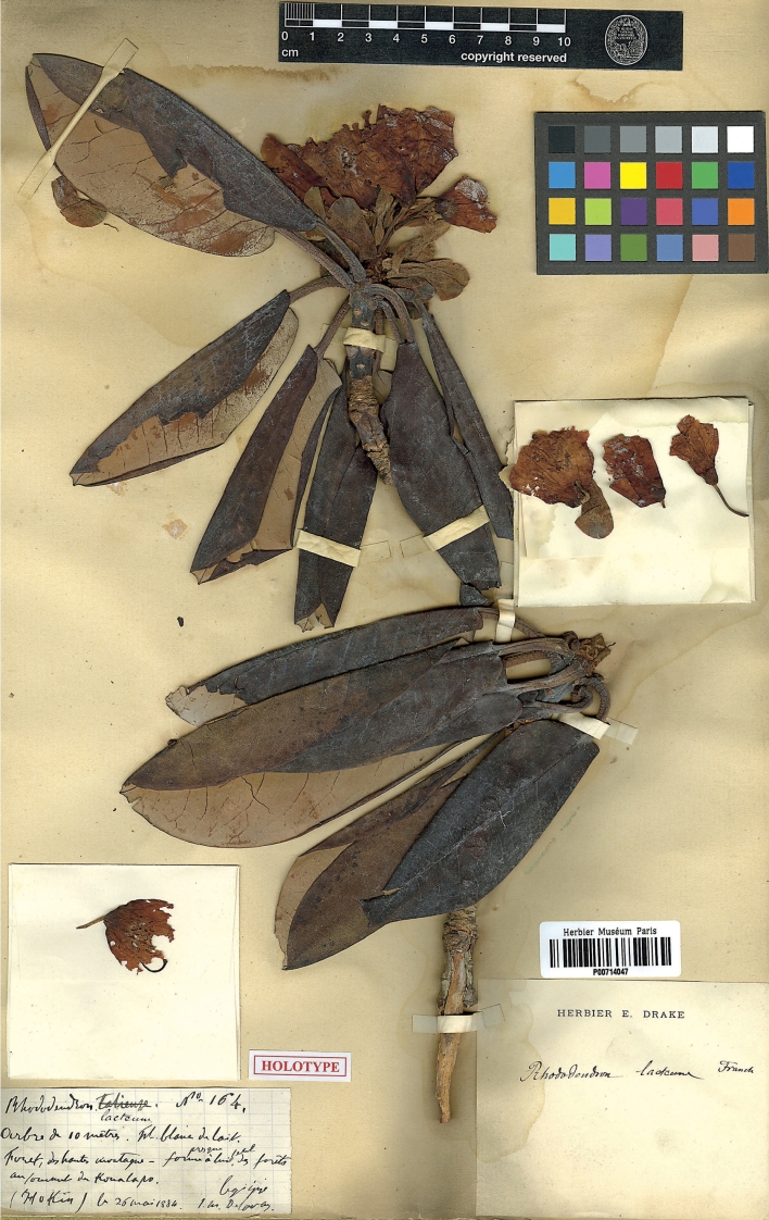 【形态特征】常绿灌木或小乔木,高2~8m;小枝粗壮,疏被灰白丛卷毛;老枝无毛,叶痕明显。叶厚革质,常集生于小枝顶端,叶片宽椭圆形至倒卵状椭圆形,长8~17cm,先端圆钝,具短凸尖头,基部圆,略呈心形,边缘稍外卷,略呈波状,上面绿色,微皱,侧脉14~16对,下面被薄层毛被,由淡黄棕色至灰黄棕色的放射状毛组成;叶柄长2~3cm,粗壮,上面具沟,下面圆形,初被灰白色丛卷毛。顶生总状伞形花序,有花15~30朵,密集,总轴长3~3.5cm,疏被丛卷毛;苞片宽长圆形,长3~4cm,两面密被绢状柔毛;花梗长2~3cm;花萼小,长1~1.5mm,5裂,裂片三角形,外面疏被微柔毛,边缘具睫毛;花冠宽钟形,长3.5~4.5cm,裂片5,近圆形,长约1.5cm,顶端微缺;雄蕊10,长1.5~2.5cm,花丝基部密被白色微柔毛;雌蕊比花冠短,略长于雄蕊;子房圆锥形,长5~6mm,密被淡棕色绒毛,花柱绿色,无毛,柱头小。蒴果长圆柱形,长2~3cm,略弯,被毛。