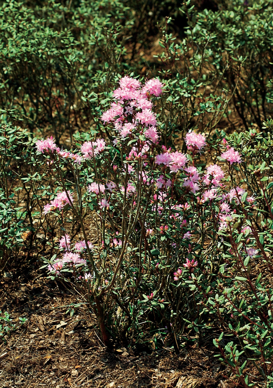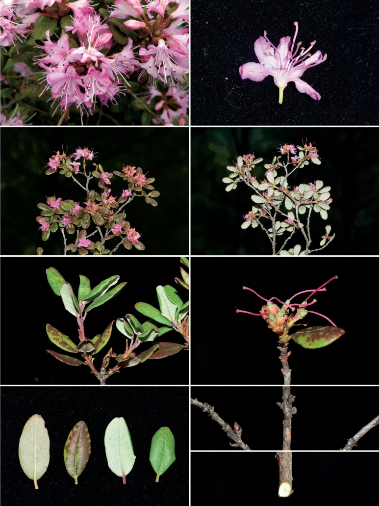 【形态特征】小灌木,高0.15~2m。幼枝短而细,被黑褐色腺鳞,无毛或有时被微柔毛。叶片多数,散生,揉之有香气,长圆形或长圆状椭圆形,长1.5~4cm,顶端钝圆或锐尖,具小短尖头,基部钝圆或楔形渐狭,边缘反卷,上面密生黑色或淡褐色小鳞片,下面通常灰白色,密被褐色鳞片,鳞片中等大小,近等大,相距不超过其直径也不相邻接,侧脉在两面均不明显,网脉在上面明显或不显;叶柄短,长2~4mm,被鳞片。花序腋生枝顶或枝上部叶腋,有花2~3朵;花芽鳞多数覆瓦状排列,于花期仍不落;花梗纤细,长0.5~1cm,密被鳞片;花萼小,环状或波状浅裂,被鳞片;花冠小,宽漏斗状,长0.9~1.4cm,粉红色或淡紫红色,中部或中部以下分裂,裂片开展,外面疏生鳞片或无;雄蕊10,伸出花冠外,花丝基部密被开展的柔毛;子房5室,密被鳞片,花柱长于雄蕊,洁净,或有时基部有短柔毛。蒴果长圆形,长0.5~1cm,被鳞片。