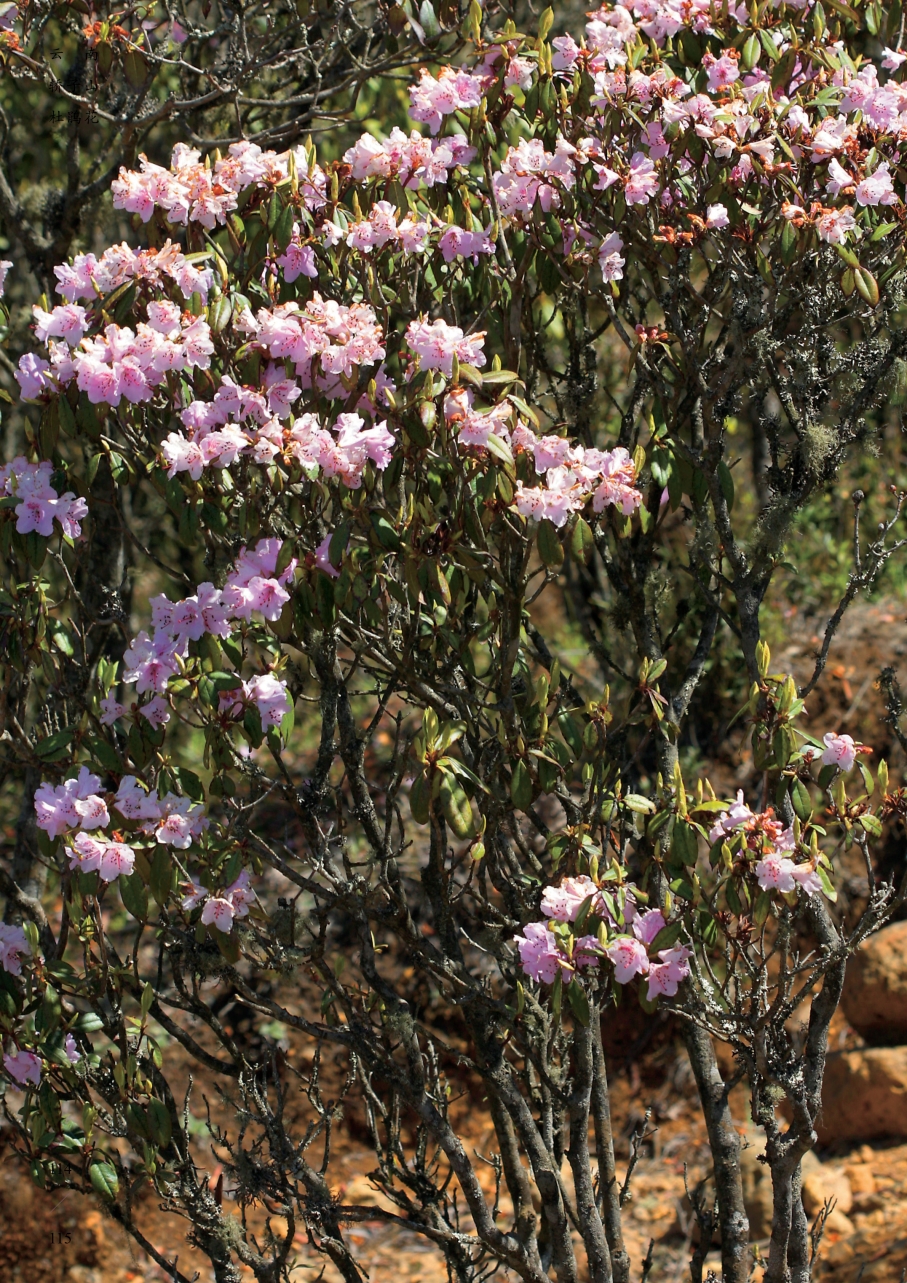 【形态特征】常绿灌木或小乔木,高1~3m。幼枝粗壮,褐色,有鳞片。叶通常向下倾斜,椭圆形、椭圆状披针形,长3.5~8cm,顶端通常渐尖,基部宽楔形以至钝圆,上面密被鳞片,以后渐疏,下面密被锈红色鳞片,鳞片通常腺体状,有时薄片状,大小不等,大鳞片褐红色或黑褐色,散生但常密生于中脉两侧,小鳞片覆瓦状排列或相距为其直径之半;叶柄密生鳞片。花序顶生,5~7花,伞形着生;花梗长密被鳞片;花萼短小,边缘状或浅5圆裂,密被鳞片;花冠宽漏斗状,淡紫色、紫红色、玫瑰红色、淡红色色罩,少有白色带淡紫色晕,内有紫红色或红色斑点,外面被疏散的鳞片;雄蕊10,不等长,略伸出花冠,花丝下部被短柔毛;子房5室,有密鳞片;花柱长过雄蕊,不被毛。蒴果长圆形,长达1.8cm。