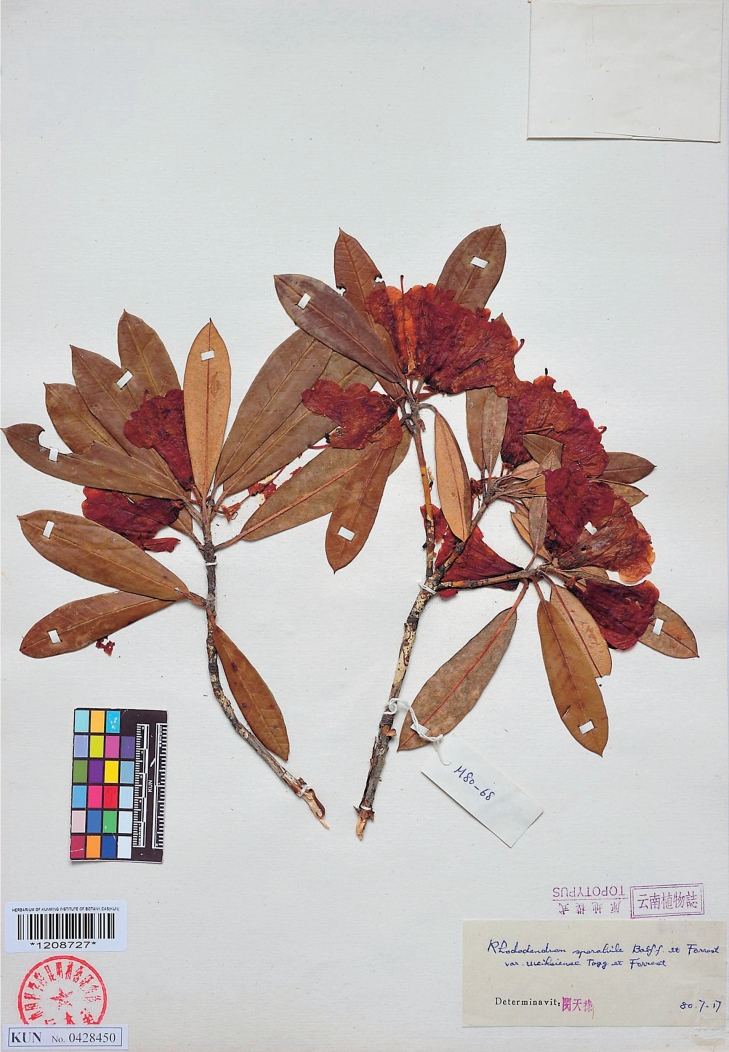 【分类地位】常绿杜鹃亚属 Subgen. Hymenanthes;常绿杜鹃组 Sect. Ponticum;火红杜鹃亚组 Subsect. Neriiflora;纯红杜鹃 Rhododendron sperabile