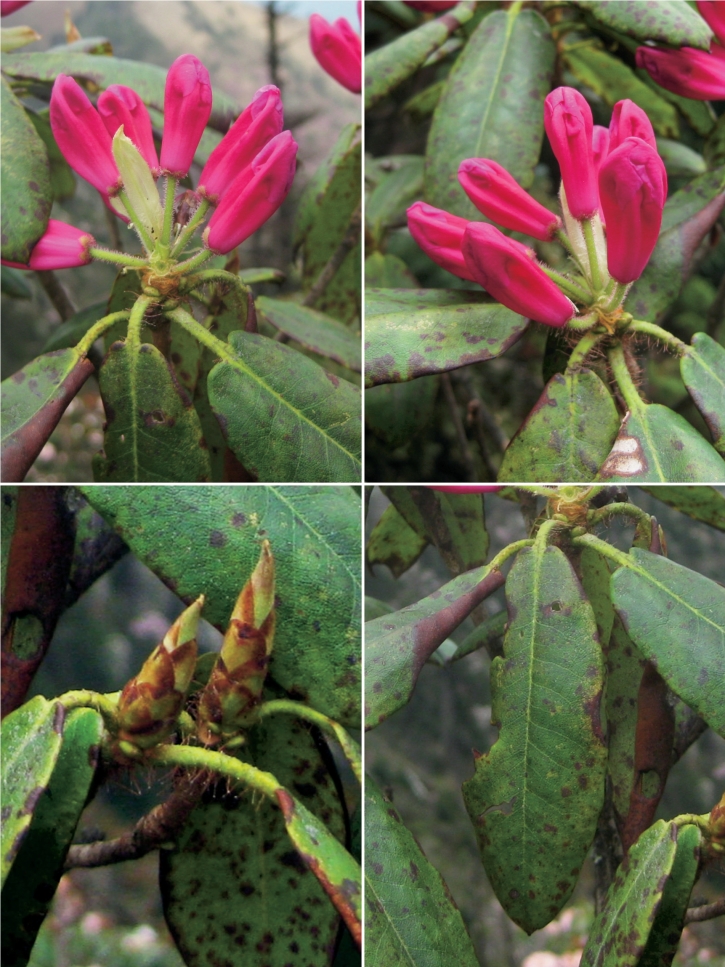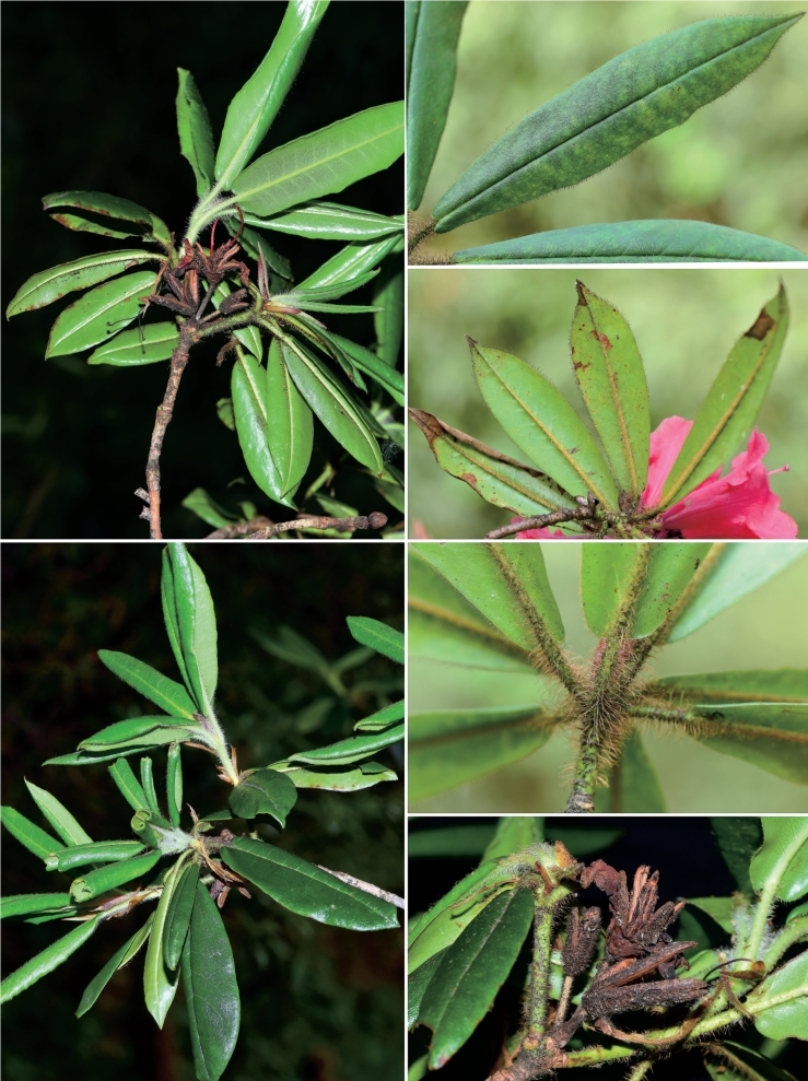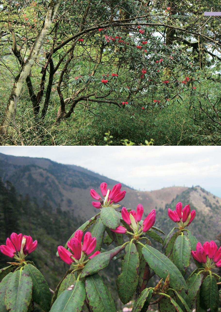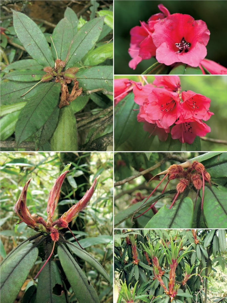 【形态特征】常绿灌木或小乔木,高2~5m;树皮灰色或灰褐色;幼枝淡黄绿色,密被褐色腺头刚毛。冬芽卵圆形,略有贴生短柔毛。叶革质,通常5~8枚集生枝端,长圆状披针形或倒披针形,先端短渐尖,有时尾状,基部狭圆形或近心形,边缘反卷,幼时具纤毛,有散生黄褐色粗伏毛,中脉在上面呈深沟状,有时近基部具褐色刚毛,下面密被褐色绒毛及腺头刚毛,侧脉15~18对;叶柄稍粗壮,密被黄褐色有分枝柔毛及腺头刚毛。顶生短总状伞形花序,有花8~12朵;总轴长约1.5cm;花梗长6~15mm,红色,密被腺头刚毛;花萼小,淡红色,裂齿5,三角形,外面被柔毛,边缘有纤毛;花冠管状钟形,深红色,内面基部有黑红色斑块,裂片5,顶端有缺刻;雄蕊10,花丝白色,无毛,花药长圆状椭圆形,长1~2mm,紫褐色至黑色;子房卵圆形,长约5mm,密被淡紫色腺毛,花柱长3.5cm,红色,无毛,红色。蒴果圆柱形,长1~2cm,有肋纹及棕色刚毛,6~8裂。