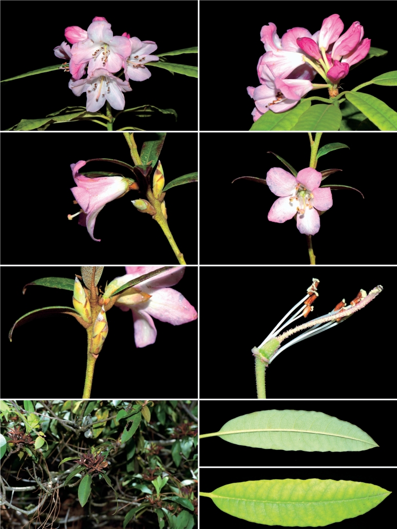 【形态特征】小灌木,高1~2m。枝条细长,褐色,密被鳞片。叶革质,狭长圆形或长圆状披针形,长2~5.5cm,顶端钝或锐尖,有小短尖头,基部楔形或钝圆,边缘反卷,上面密生腺鳞,以后渐脱落,下面灰绿色,密被大小不等的鳞片,通常有腺体状和片状两种,相距小于其直径至近相等,侧脉纤细,在叶面几不可见,在背面略显,网脉在两面均不明显;叶柄长3~4mm,密被褐色鳞片。花序腋生,每花序1~2朵花;花芽鳞于花期仍不落,覆瓦状排列,外面无毛或被灰白色微柔毛及散生数个鳞片;花梗长3~4mm,密生鳞片;花萼裂片长圆形或半圆形,顶端圆形,长1~2mm,外面有鳞片;花冠钟状或漏斗状,长1.5~2cm,淡红色,偶有白色,中部以上5裂,裂片开展,外面密被鳞片和灰白色短柔毛;雄蕊10枚,长雄蕊近与花冠等长,花丝基部疏生柔毛;子房5室,密被鳞片,花柱伸出花冠,下部疏被鳞片和柔毛。蒴果长圆状球形,长0.7~1.2cm,密被褐色腺鳞。