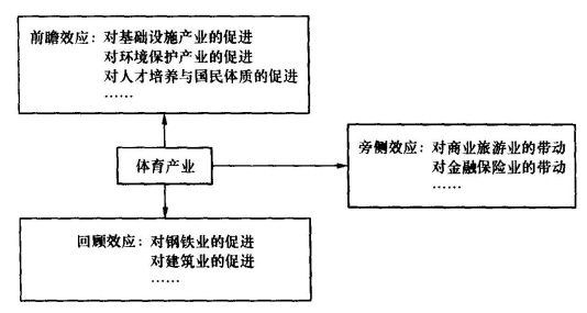 一是源自于回顾效应的逆向波及线路:体育产业的发展沿着体育产业→提供体育产业所需的中间产品的先行产业(如体育场馆设施、器械、用品、通讯、交通、环保)→这些先行产业的先行产业(如体育场馆设施建设、通信、交通产品制造所需要的物料和能源行业)的线路,向其先行产业发生逆向波及。这些先行产业的发展,又会引起其先行产业的发展,由此产生第一波、第二波,以至其后第N波的影响。