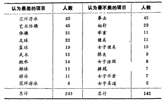 在现代社会,人们对武术已经具有了基本稳定的审美意识。还是这主要表现在,无论是中国人还是外国人,年长的人还是年轻人,他们对武术美的感受基本上都是一致的。1989年,成都体育学院对300名在校的男女大学生进行了一次问卷式调查。调查的问题是:您认为体育活动中哪一项运动最美?哪一项运动最不美?调查结果统计如下表: