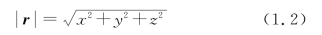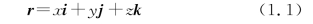 从图1.2中可以看出,位矢r在x轴、y轴和z轴上的投影(即质点的坐标)分别为x、y和z。所以,质点在直角坐标系中的位置既可以用位置矢量r来表示,也可以用坐标x、y和z来表示。因此,位置矢量r也可写成