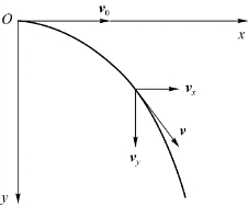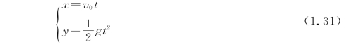 平抛运动是指物体只在重力作用下,从水平初速度开始的运动。设有一质点以初速度v 0被水平抛出,做平抛运动。可以将它分解为水平方向以初速度v 0做匀速直线运动,竖直方向做自由落体运动(图1.9)。若以抛出点为原点,x轴沿初速度方向,y轴沿竖直向下方向,建立平面坐标系,则其运动方程为