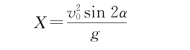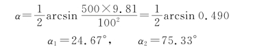 只要X小于最大射程,α在0~90°有两个解。例如,X=500 m,v 0=100 m/s,则