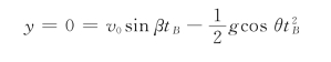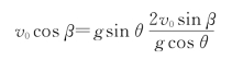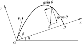 例1.8 一个人在倾角为θ的斜坡的下端O点处,以与斜坡成β角的初速度v 0抛出一个小球,小球下落时恰好垂直击中斜面。如果不计空气阻力,试证明β满足下列条件:tanβ=