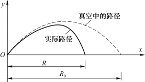 斜抛运动的轨迹是对称的。在上述讨论中,忽略了空气阻力的影响。若空气阻力较大,则抛体的路径为一个不对称的曲线,实际射程比真空射程小,如图1.13所示。