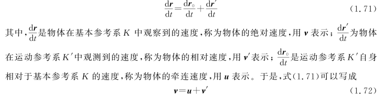 即绝对速度等于相对速度与牵连速度的矢量和,这一关系式称为伽利略速度变换公式,也叫经典力学的速度变换定理,它描述了不同参考系之间的速度变换关系。