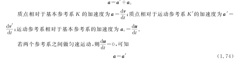 在相对做匀速直线运动的参考系中观察同一质点的运动,加速度的描述相同。伽利略速度变换公式只适用于物体运动速度远远小于光速的情况。