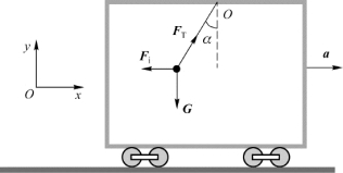 顶部,另一端系一小球,当列车以加速度a行驶时,细杆偏离竖直线α角,试求加速度a与摆角α之间的关系。