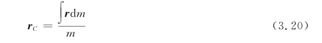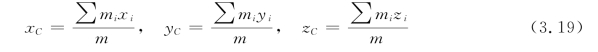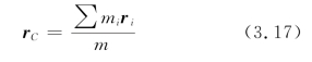 设一个质点系由N个质点组成,以m 1,m 2,…,mi,…,m N分别表示各质点的质量,以r 1,r 2,…,ri,…,r N分别表示各质点对某一坐标原点的位矢,如图3.9所示。设质心C的位矢为r C,它的定义式如下: