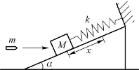 6.如习题图3.14所示,光滑斜面与水平面的夹角为α=30°,轻质弹簧上端固定。今在弹簧的另一端轻轻地挂上质量为M=1.0 kg的木块,木块沿斜面从静止开始向下滑动。当木块向下滑x=30 cm时,恰好有一质量m=0.01 kg的子弹沿水平方向以速率v=200 m/s射中木块并嵌在其中。设弹簧的劲度系数为k=25 N/m。求子弹打入木块后它们的共同速度。